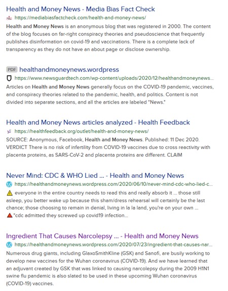 As the image on the left below reveals, the Left denigrates anyone that reveals information they don’t want revealed. The other search engine results provides general information for various articles written by “Health and Money News“.