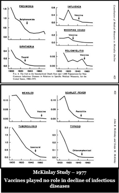 1977 – The McKinlays prove vaccines played no role in the 90% drop in deaths from the top infectious diseases in the U.S.- that drop happened BEFORE the vaccines were developed.