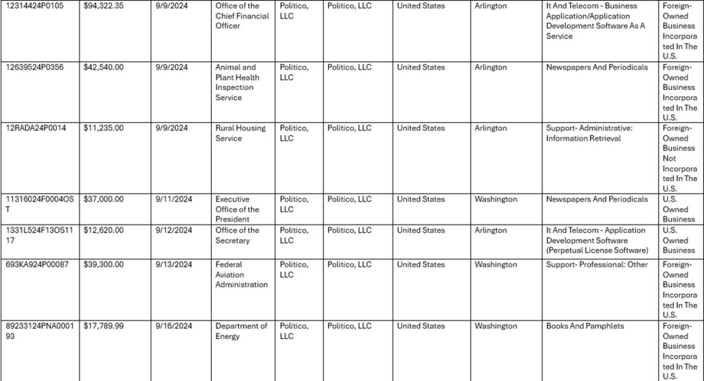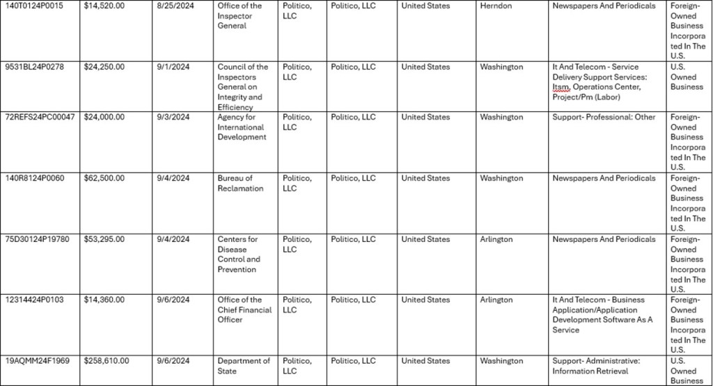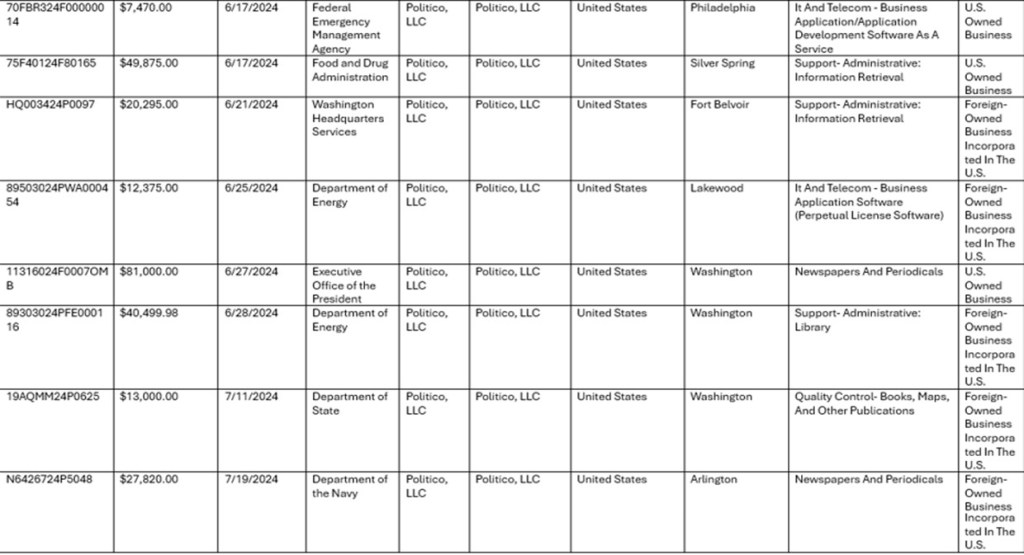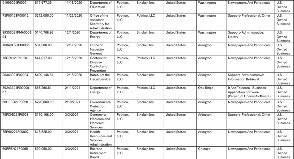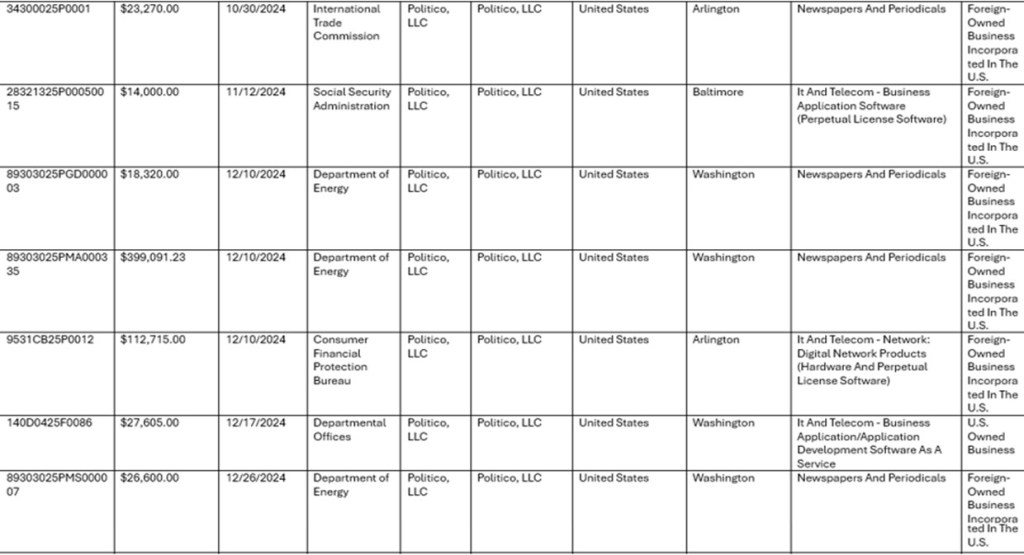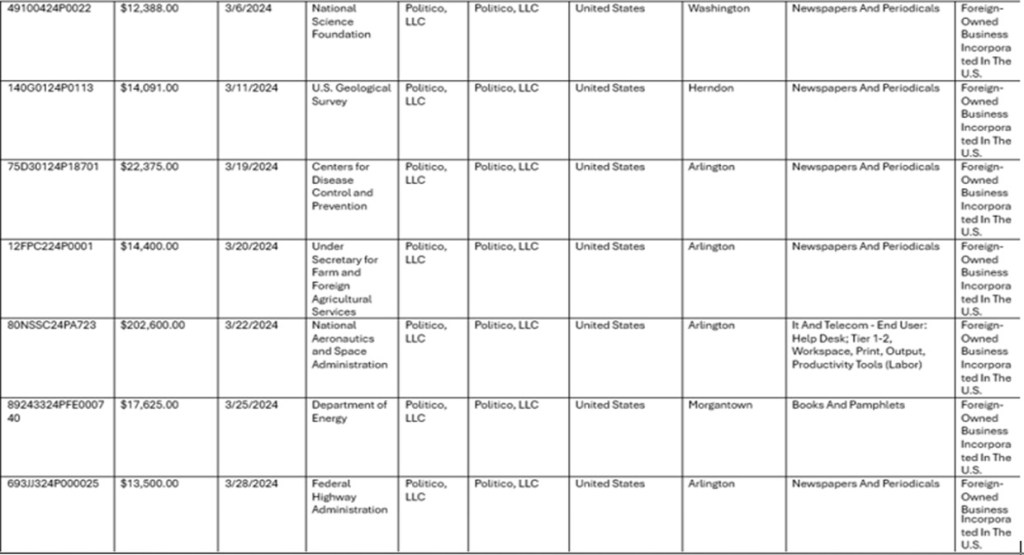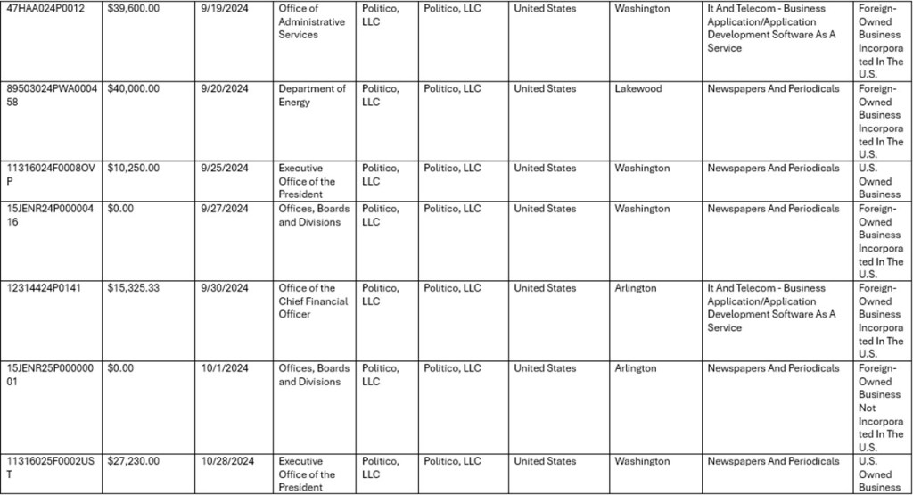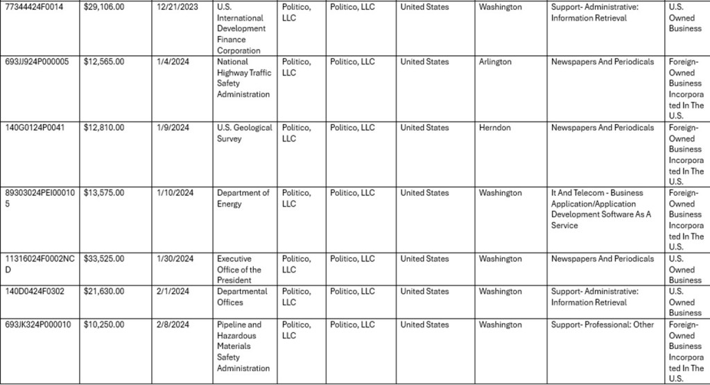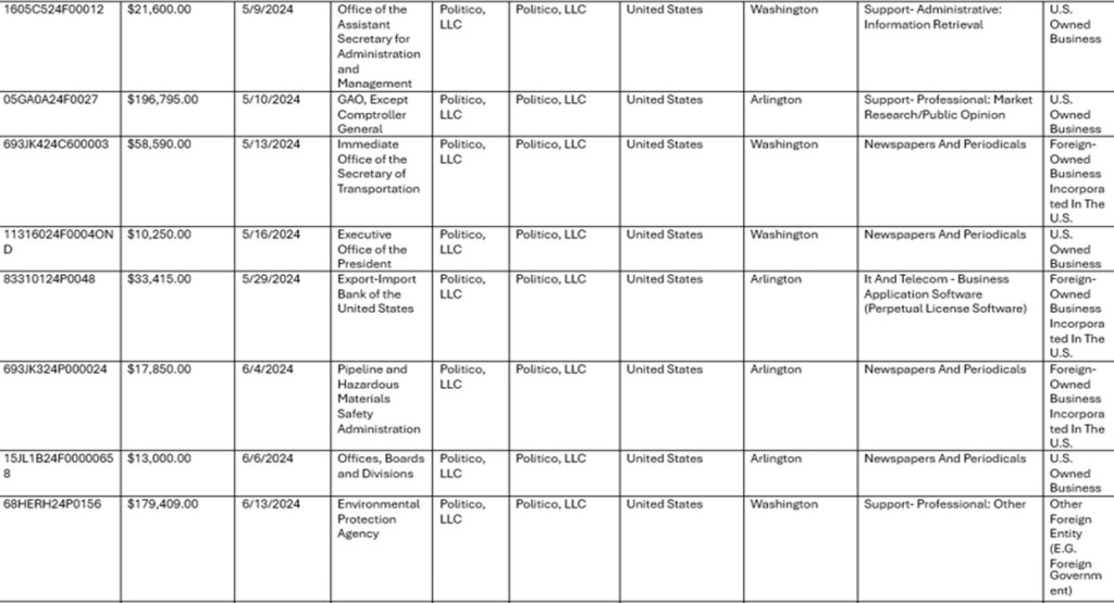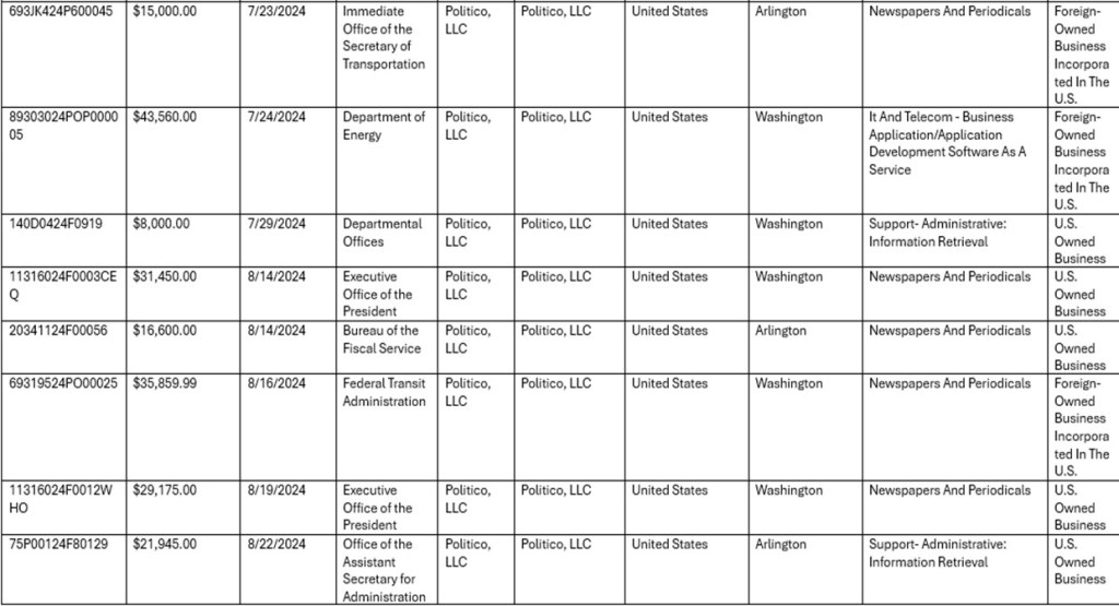 The Politico data is for the period Jan. 1, 2009 – Feb. 11, 2025 from usaspending.gov. The total Politico received was $34,824,358.18.