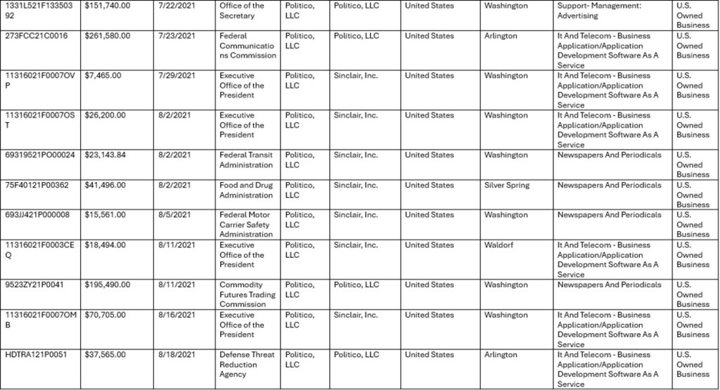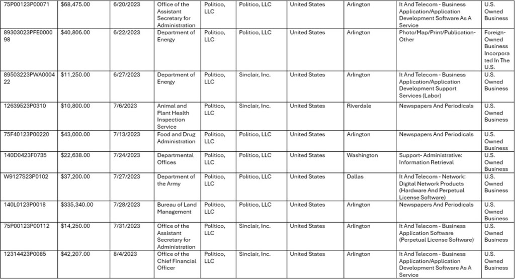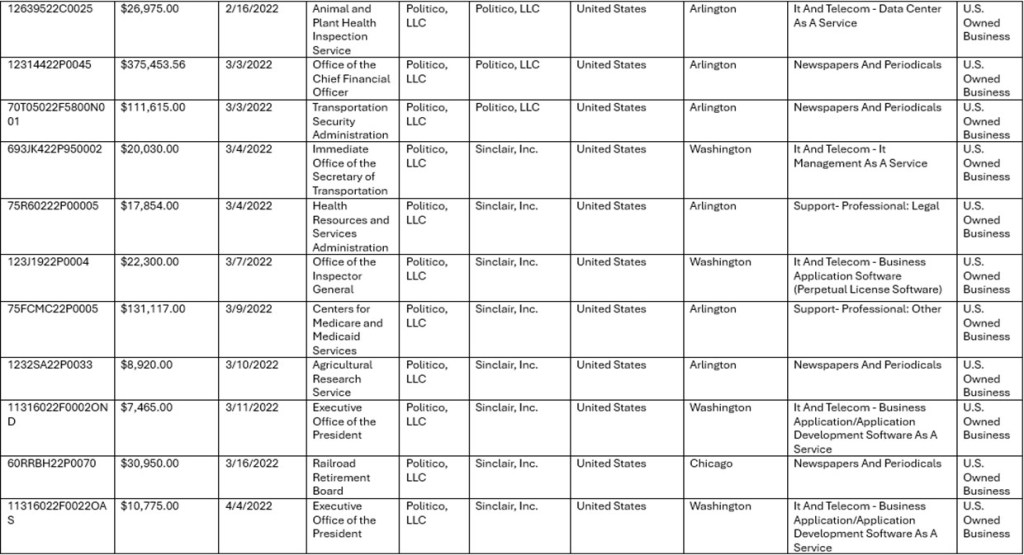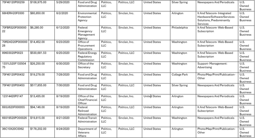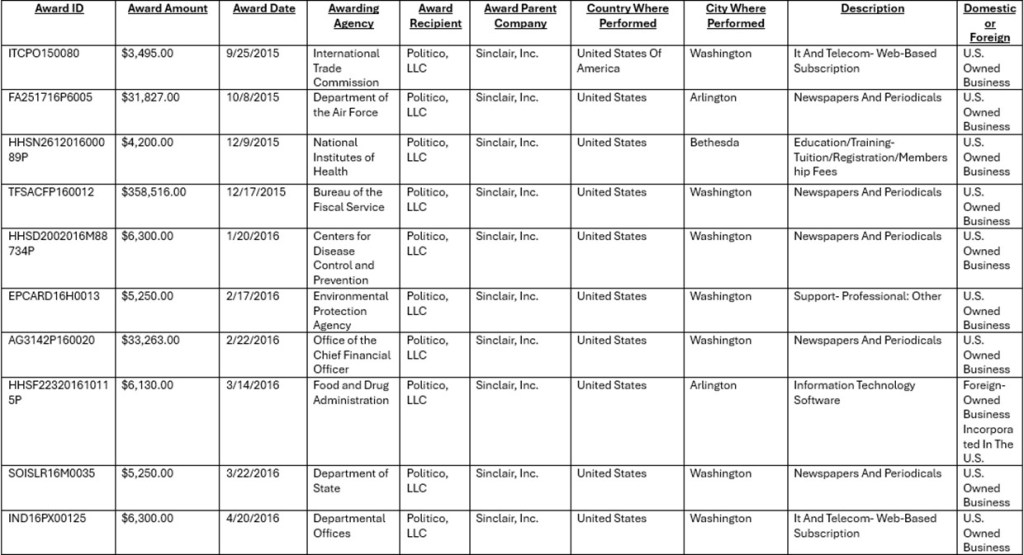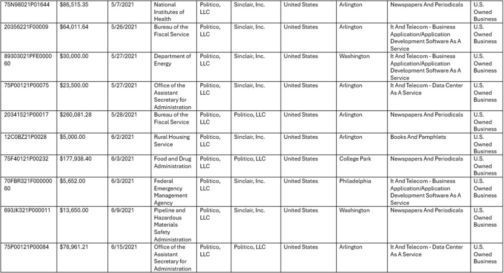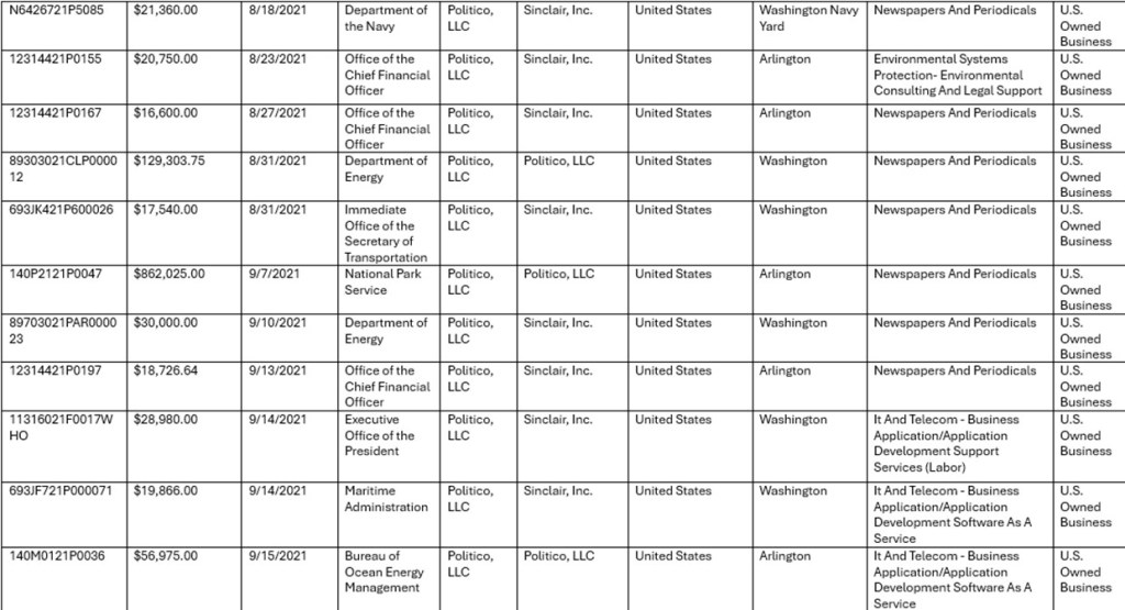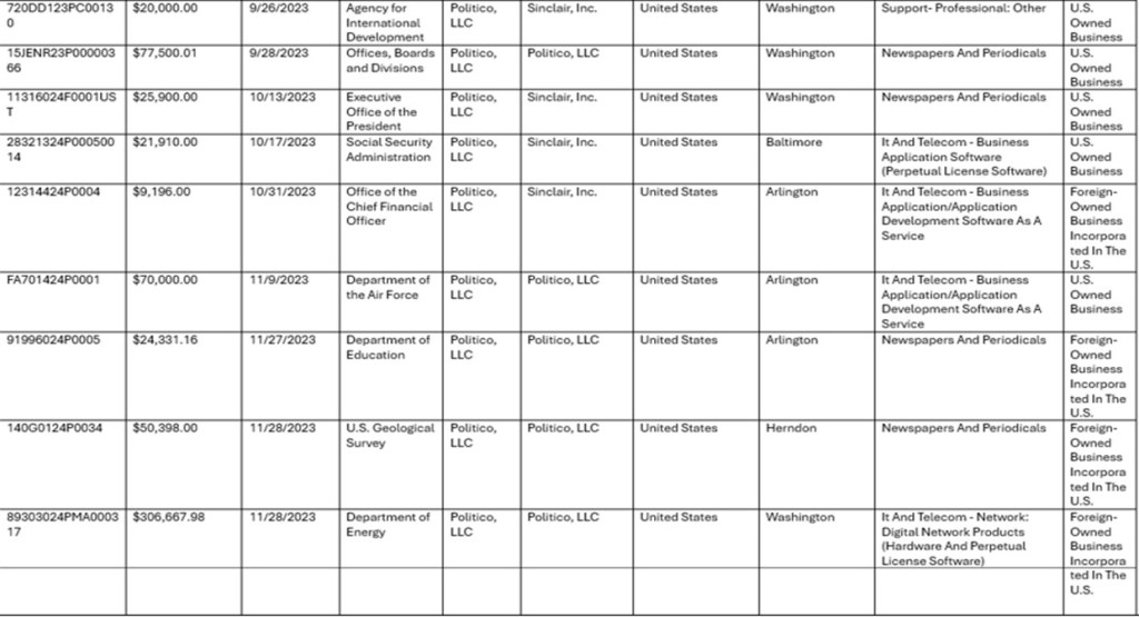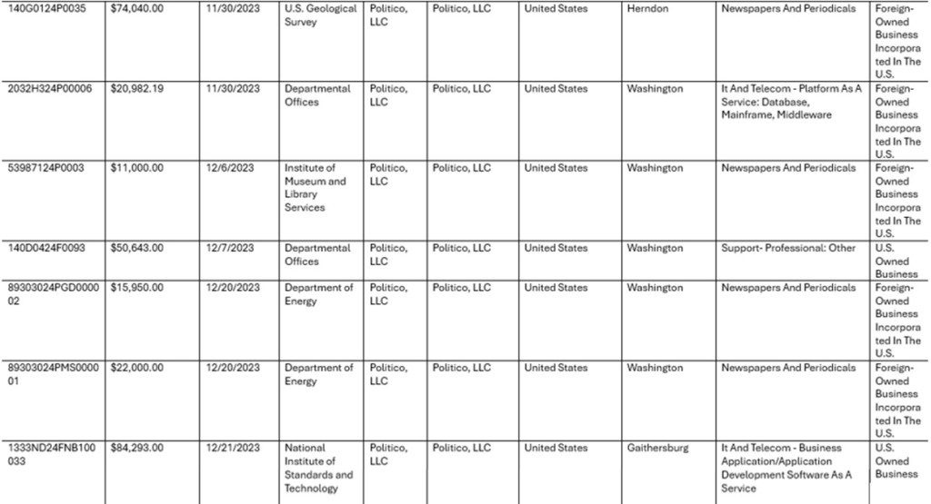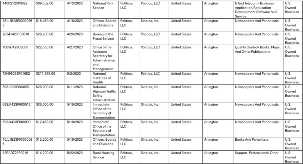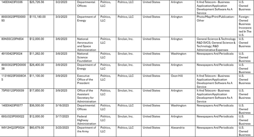 The Politico data is for the period Jan. 1, 2009 – Feb. 11, 2025 from usaspending.gov. The total Politico received was $34,824,358.18.
