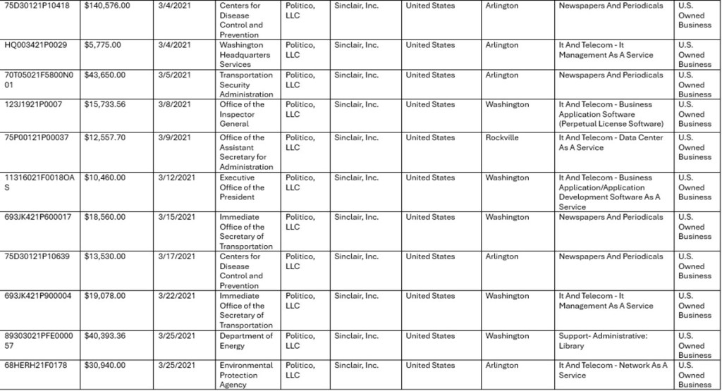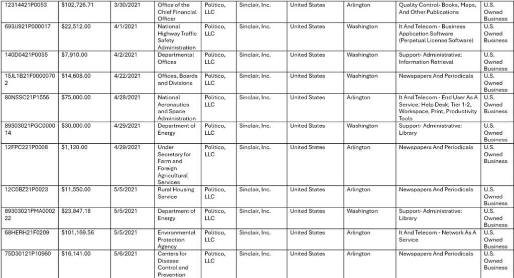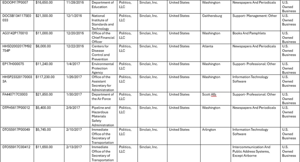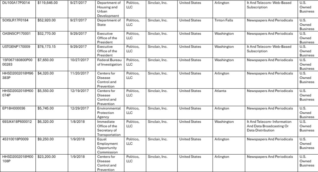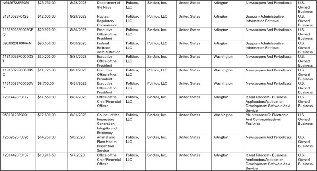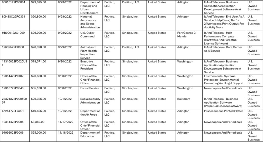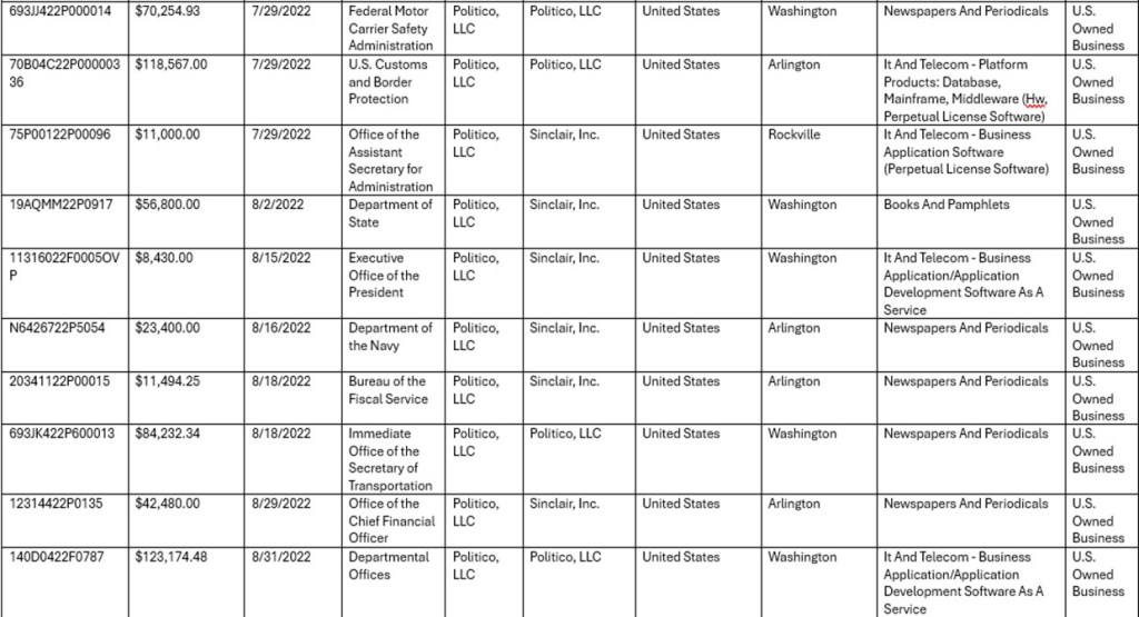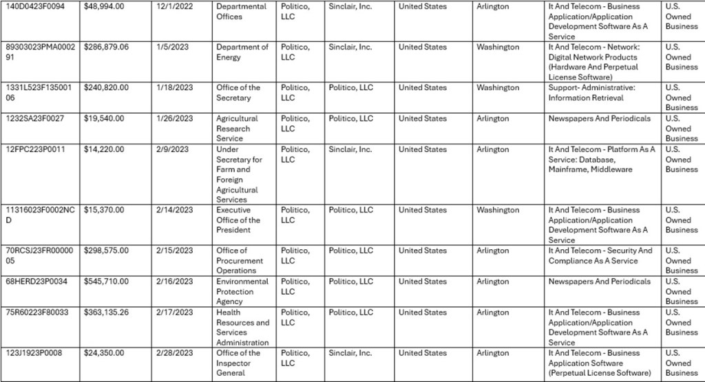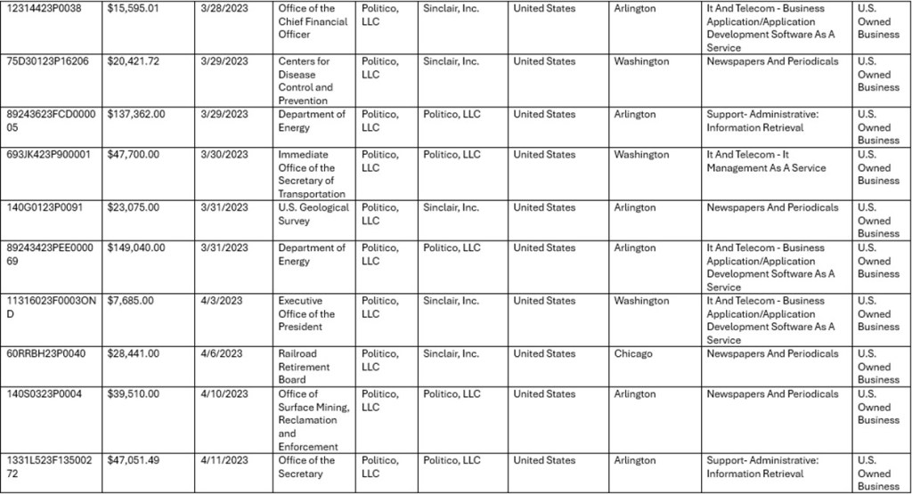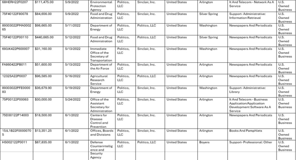 The Politico data is for the period Jan. 1, 2009 – Feb. 11, 2025 from usaspending.gov. The total Politico received was $34,824,358.18.