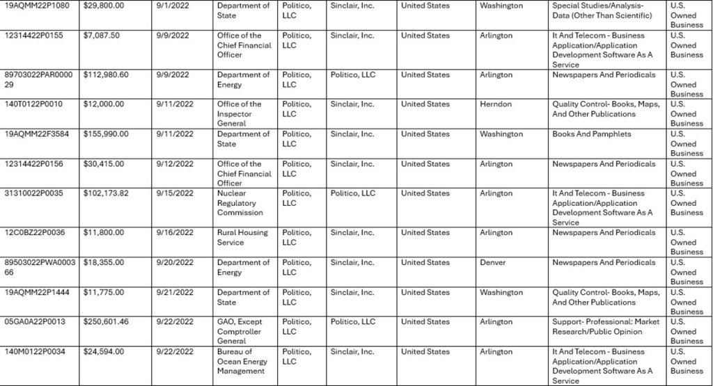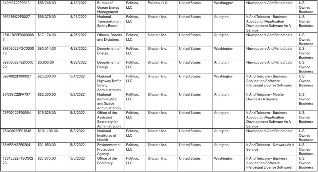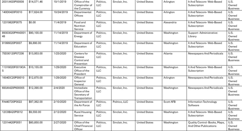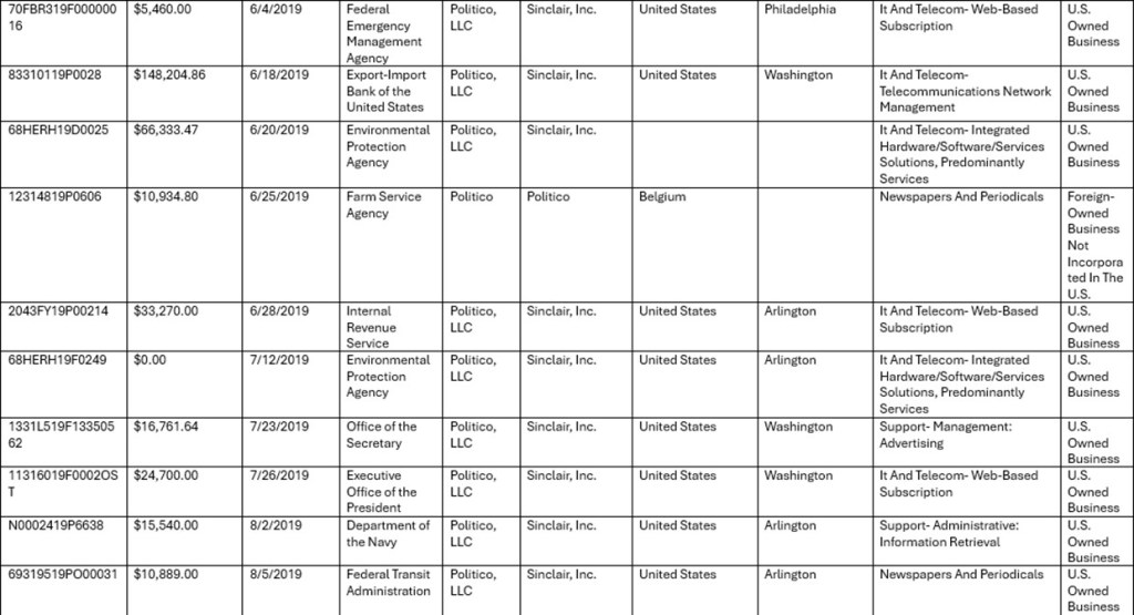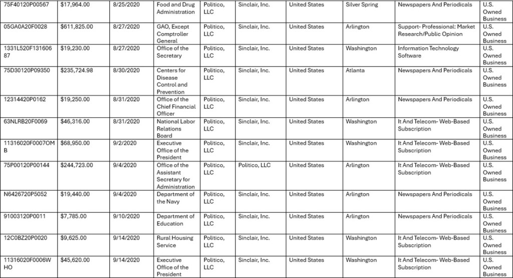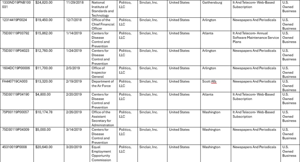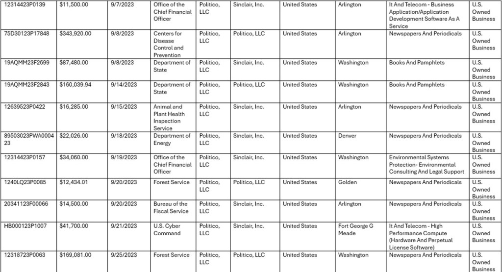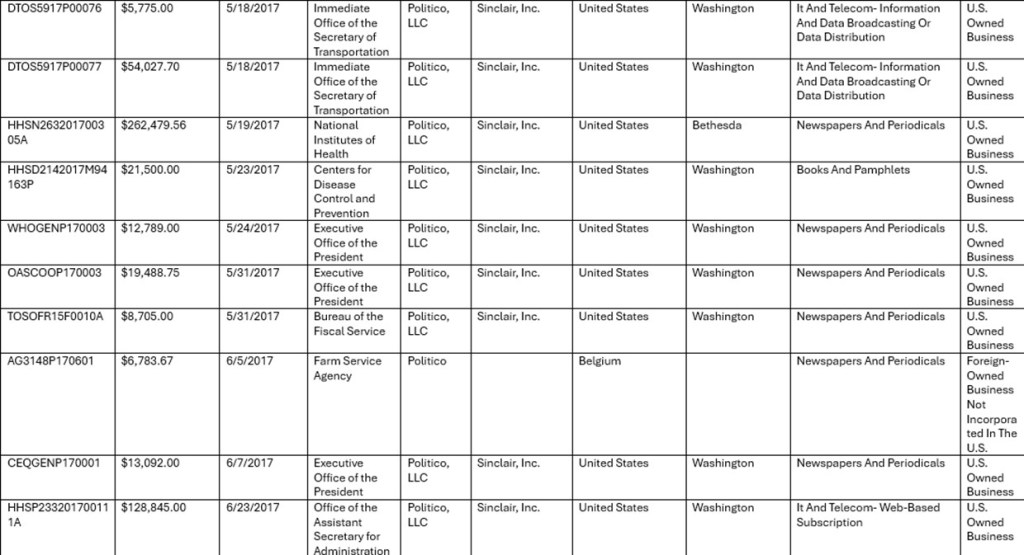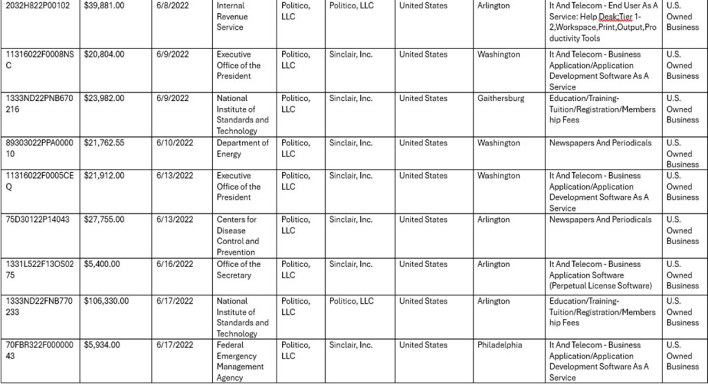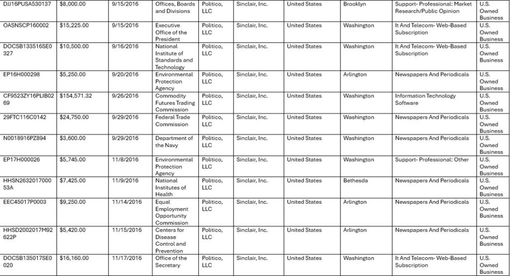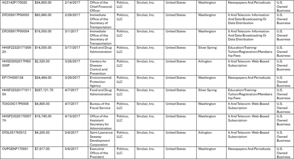 The Politico data is for the period Jan. 1, 2009 – Feb. 11, 2025 from usaspending.gov. The total Politico received was $34,824,358.18.