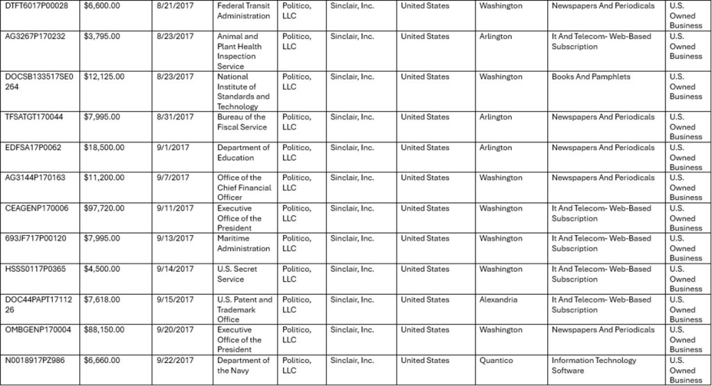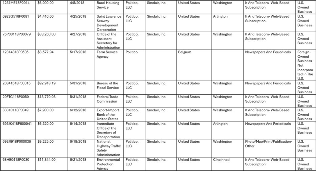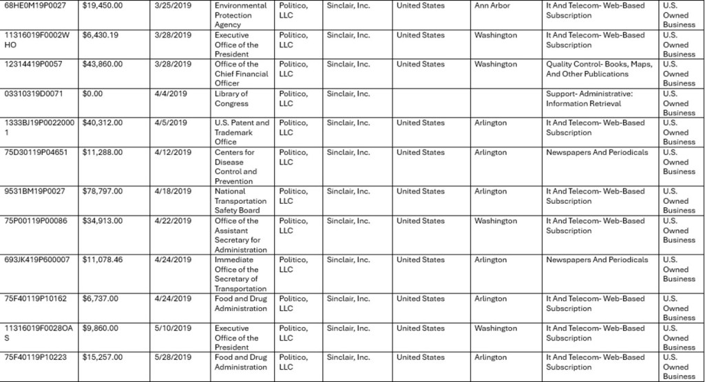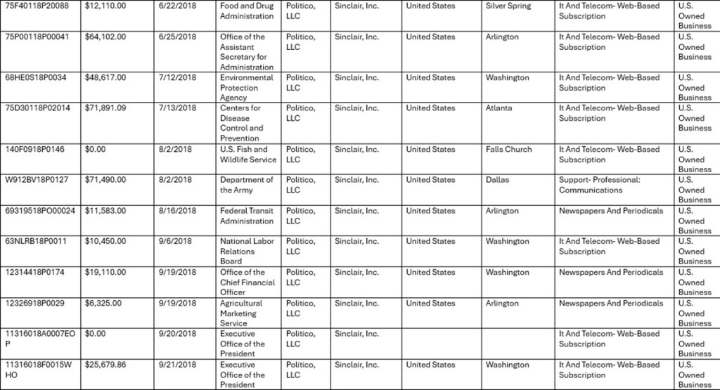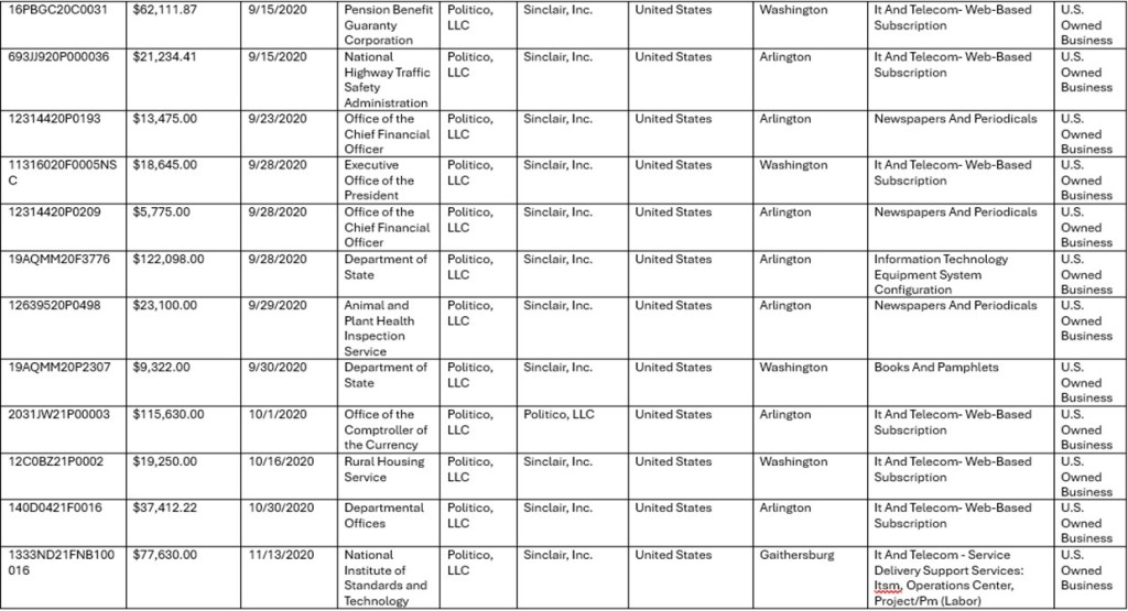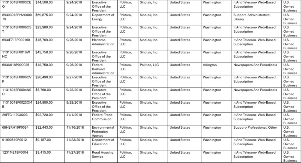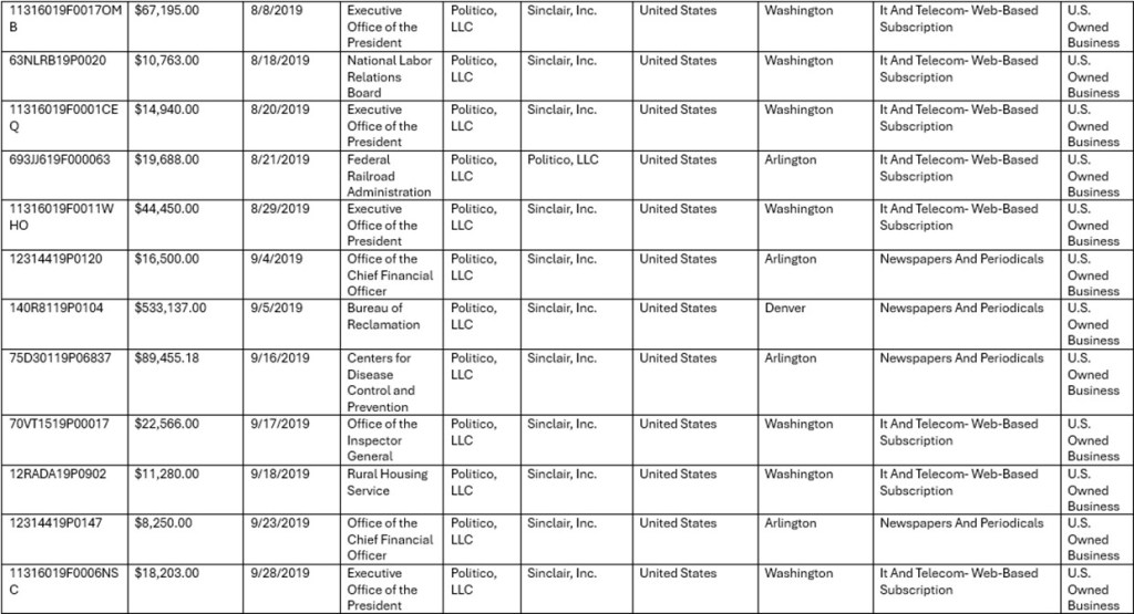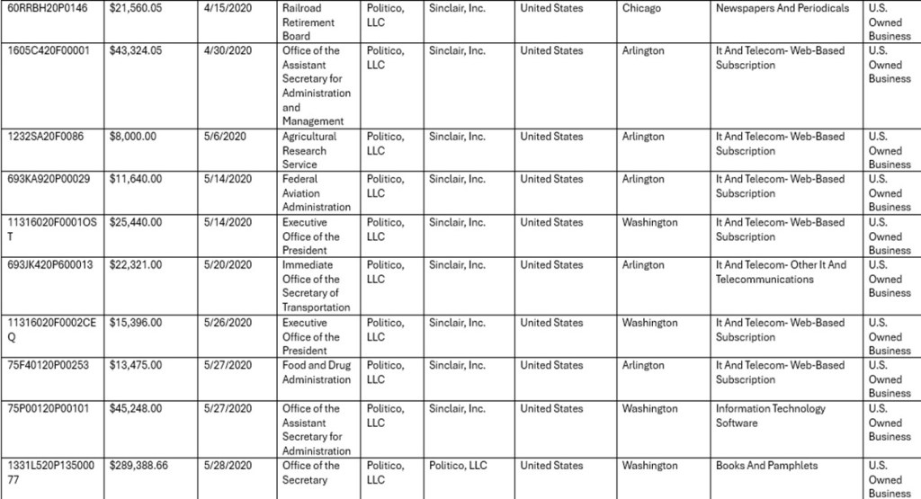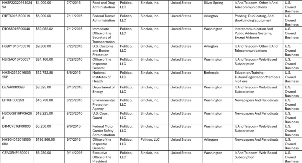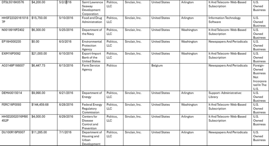 The Politico data is for the period Jan. 1, 2009 – Feb. 11, 2025 from usaspending.gov. The total Politico received was $34,824,358.18.
