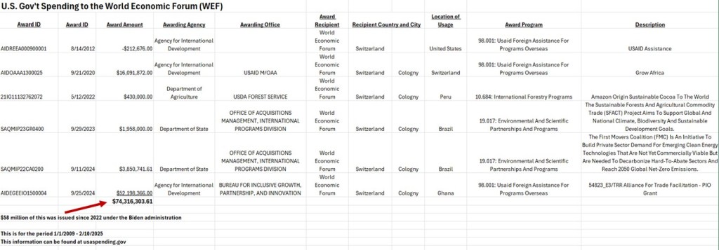 The WEF data covers the period of Jan. 1, 2009 – Feb. 10, 2025 from usaspending.gov. WEF received $74,316,303.61.