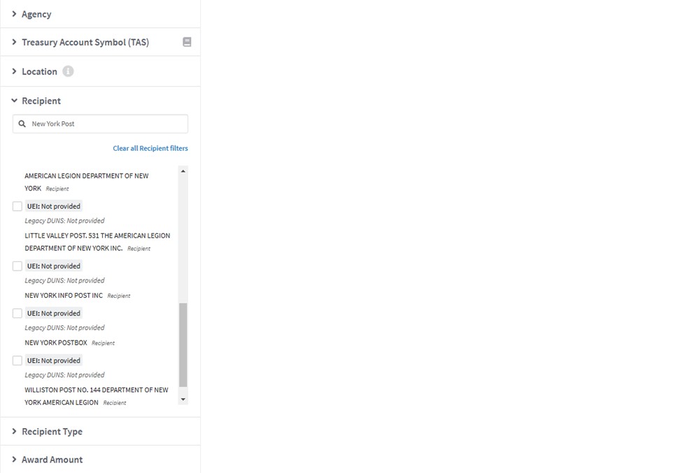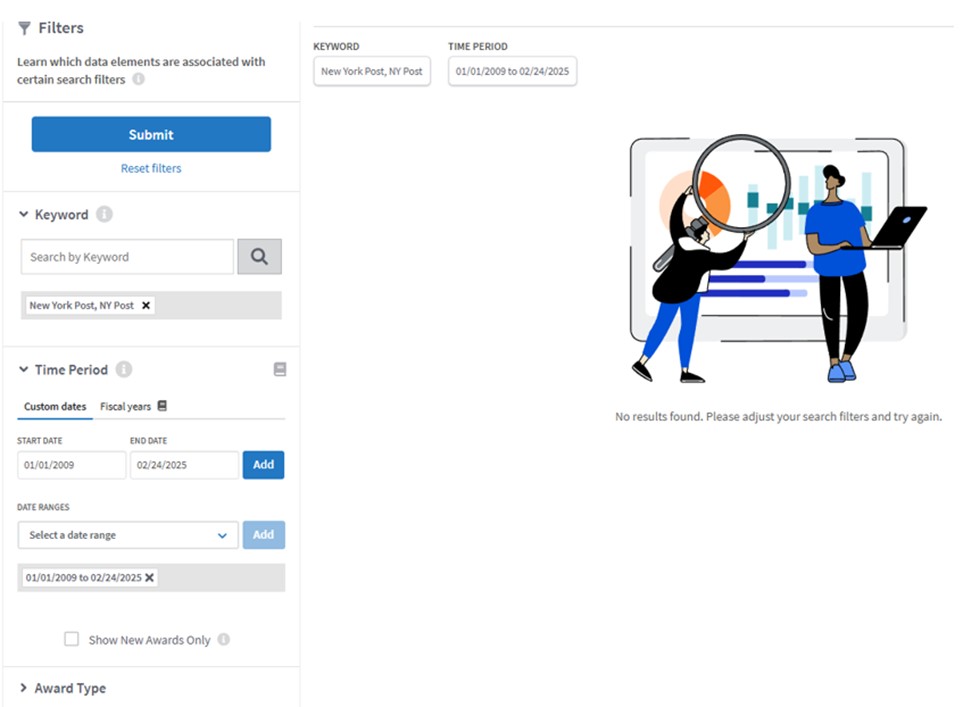 The U.S. government did not advertise or make any payments to the NY Post for the time period of 01/01/2009 – 02/24/2025. The following images displays the results of a search at usaspending.gov.