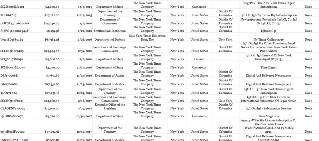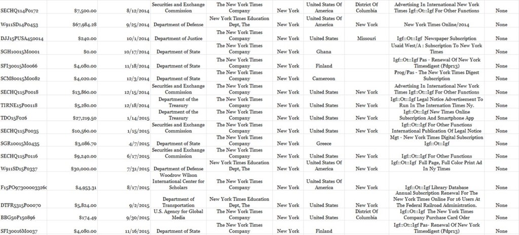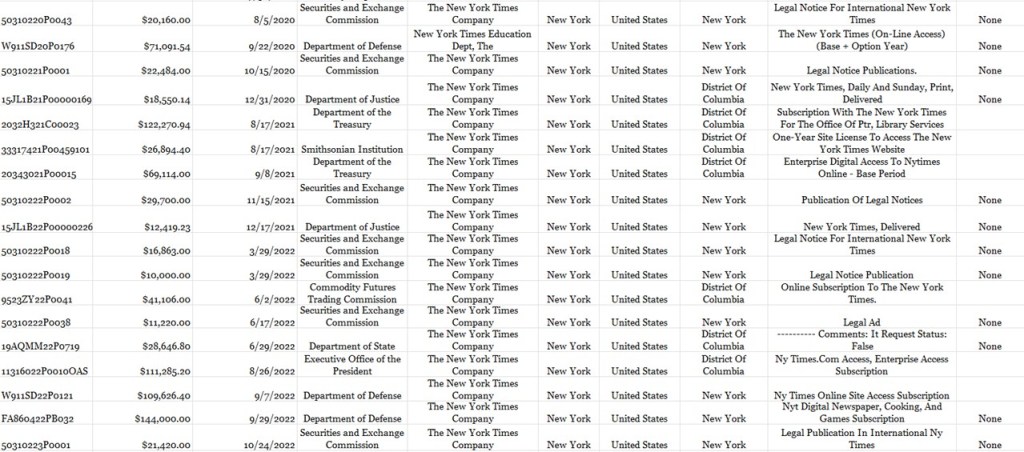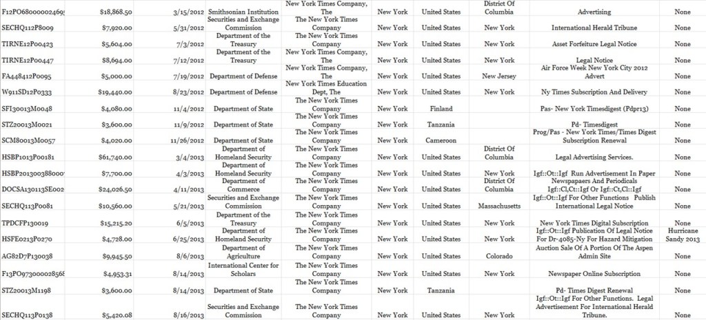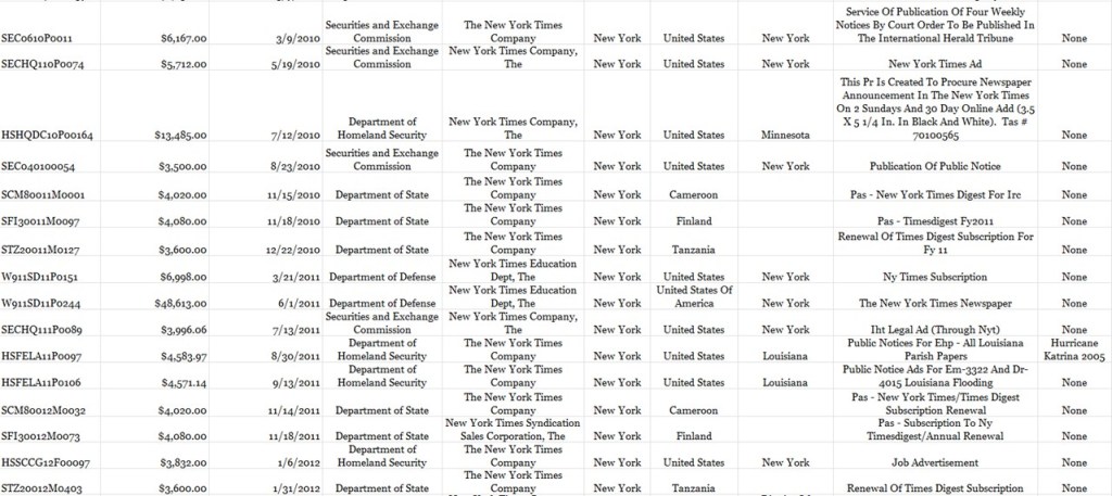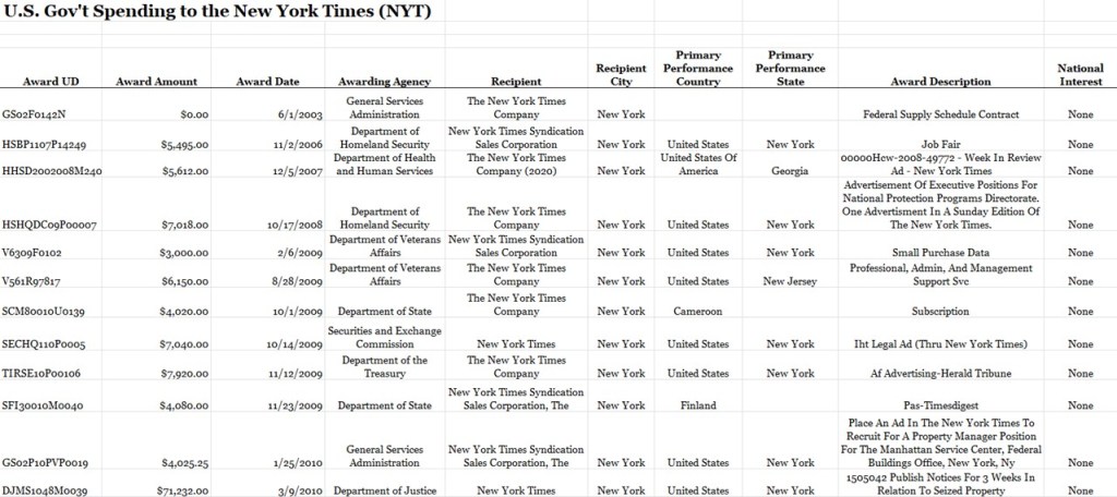 In this case, the first section in this article shows the money that was given to The New York Times from a wide variety of government agencies. Some were for job ads, subscriptions, legal notices, etc. One was for an auction notice for a piece of property in Colorado… why is the Department of Agriculture advertising the auctioning of a piece of property in Colorado in the NY Times?