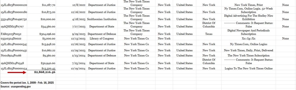 The NY Times data is for the period Jan. 1, 2009 – Feb. 16, 2025 from usaspending.gov. The total NY Times received was $2,868,216.46.